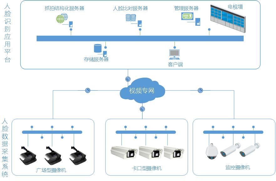 采用分布式子系统(园区出入口、重点楼宇、重点实验室、重点科室等)+中心平台(园区物业)构建基于人脸识别的1:1、1:N的立体化综合应用。
