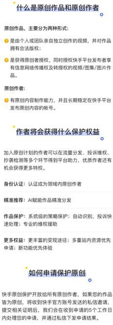 快手原创保护开放给所有原创作者,如果用户作品皆为原创,将收到快手官方账号发送的私信邀请,提交相关证明后,快手官方会在收到申请的5个工作日内处理用户的申请,并通过私信下发申请结果。