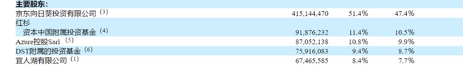 依据招股书,若按照发行前实益拥有的普通股数计算,京东集团全资子公司持股51.4%,红杉中国持股11.4%,沃尔玛集团全资子公司持股10.8%,为前三大机构股东;个人股东中,达达集团创始人兼首席执行官蒯佳祺持股8.9%,达达集团联合创始人兼首席技术官杨骏持股1.9%。