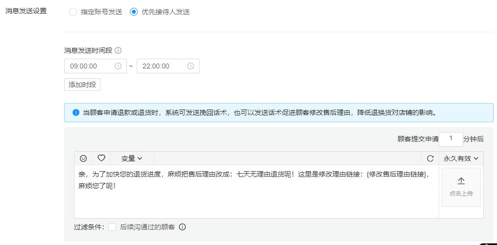 发送支持:支持制定账号和优先接待发送;支持单轮消息发送;支持发送时间配置。针对不同的客户,不同的售后理由,发送不同的跟进挽回话术,尽最大可能挽回买家。
