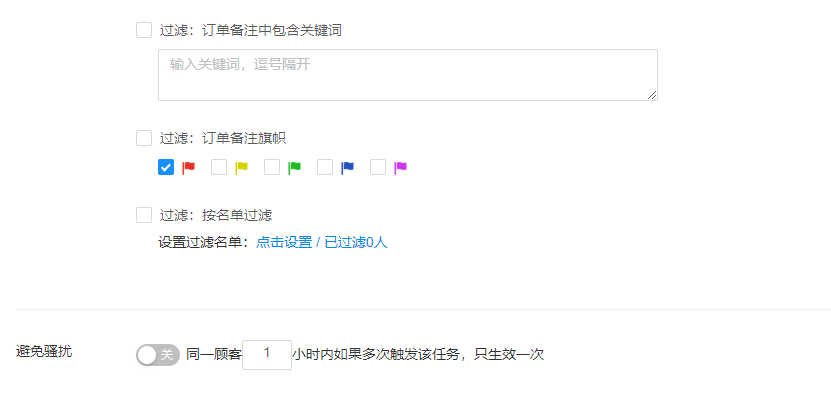 发送过滤功能避免误会和投诉:对发送对象进行过滤,针对已有的备注关键词、备注旗帜、名单过滤、防骚扰过滤,避免不必要的误会和投诉。