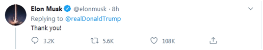 而马斯克则在推特上回应特朗普称:“谢谢你!”