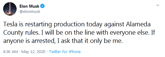 马斯克11日在推特上表示,即使违反加州阿拉米达县的规定,特斯拉仍准备复工。他甚至还言辞激烈地表示,“如果有人被捕,我要求只逮捕我”。
