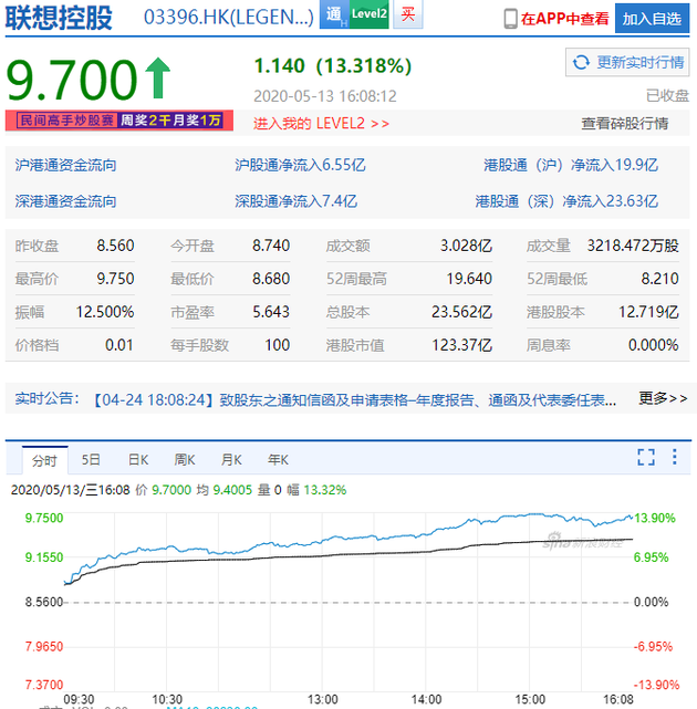 5月13日下午消息,联想控股(hk.03396)股价上涨13.32%,创上市最大涨幅。截止发稿,联想控股报9.7港元。