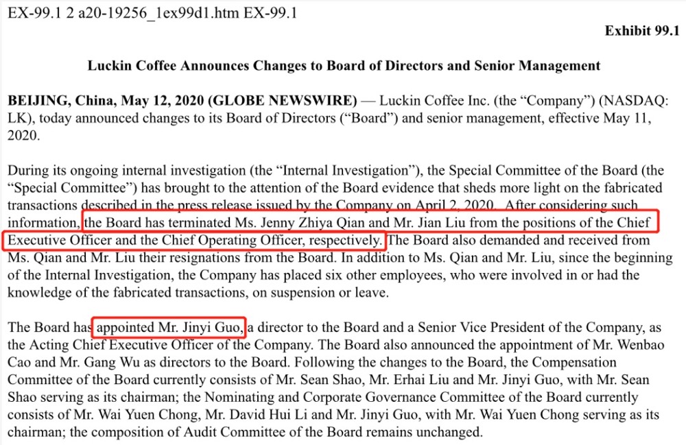 5月12日晚间,瑞幸咖啡(LK.US)宣布调整董事会和高级管理层,瑞幸创始人兼CEO钱治亚及COO刘健被暂停职务,CEO一职由联合创始人郭瑾一代理。