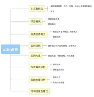 这次并购的项目和之前不一样的地方在于,需要提供尽职调查,所谓尽职调查,就是证明此并购行为不存在任何虚假行为,一般来说尽职调查分为以下几个部分。