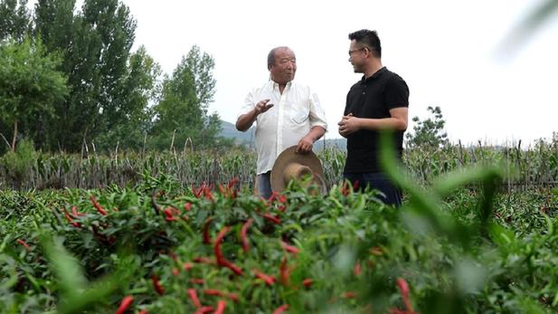山西平顺脱贫特派员聂星华(右二)与菜农交流电商、直播