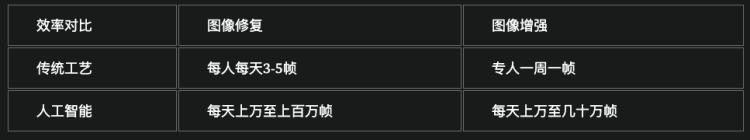 若采用纯人工方式去修复,每人每天平均只能制作 3–5 帧镜头。但借助“中影·神思”系统,修复团队得以在四个月内修复增强了 30 万帧图像。