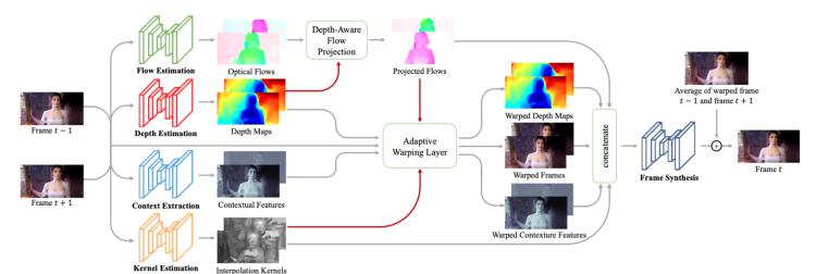 DAIN 算法不会直接生成画面,而是先通过获取视频深度信息,检测出物体遮挡情况。然后,从相邻像素收集上下文信息,来完成层次特征学习。最后,基于上述信息生成视频帧。