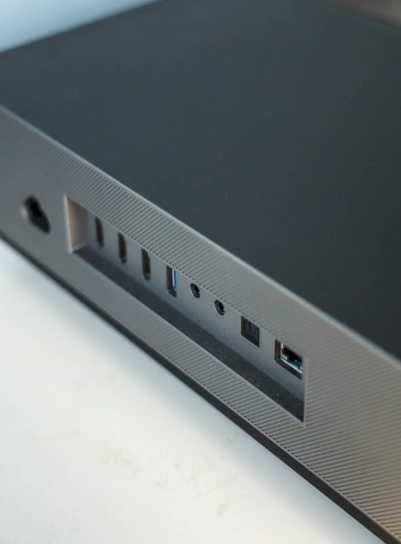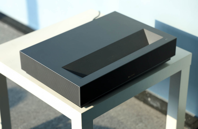 顶部是激光电视的镜头,镜头左右两侧是红外感应器的窗口,当激光电视检测到有人靠近之后,会主动降低光源亮度,防止伤害眼睛。对于孩子上网课来说,刚刚好。