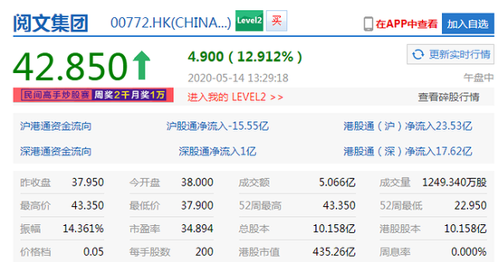 5月14日下午消息,截至发稿,阅文集团涨13%,报42.85港元。当前市值为435.26亿港元。