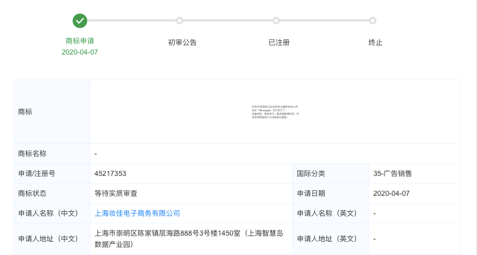 天眼查5月13日的数据显示,4月7日,上海妆佳电子商务有限公司正在申请注册声音商标“oh my god,买它买它!