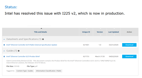我们又查询了Intel官方文档,发现早在今年3月31日,Intel就已经更新资料,确认在I225 v2版本中修复了Bug,并投入生产,正好可以赶上Z490主板顺利上市。
