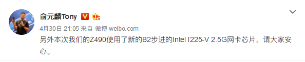 其实,华硕电脑中国区总经理俞元麟在4月30日就曾通过微博发布声明,强调华硕市售的Z490主板都采用了新的B2步进的Intel I225-V 2.5G网卡芯片。