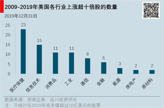 少有人知的是,在过去10年中,美股市场上涨最快的板块不是互联网,而是医疗保健。医疗保健领域出现了23只10倍股,而广受关注的信息技术和通信领域,加起来也才23只。