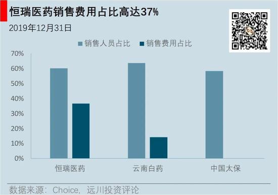 恒瑞的销售人员5168人,占员工总数比例高达63%,中国太保销售人员占比也才58%。2019年,恒瑞销售费用为85亿元,占营收的36%。以非处方药为核心业务的云南白药,同期销售费用仅占营收的14%。相比于百济神州一年63亿元的研发投入,恒瑞的39亿略显弱势,但也并不算低。