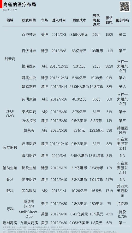 后记:高瓴在医疗健康领域的两大投资领域主要是生物医药和医疗器械,生物医药领域以四大创新药企为代表,医疗器械领域以微创医疗、沛嘉医疗、启明医疗等主攻心脏瓣膜领域的企业为代表。此外,高瓴还投了大量的不受医保控费影响的细分龙头,如爱尔眼科。下图为高瓴在医疗领域的主要布局。