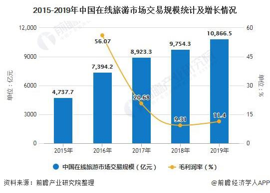 据前瞻产业研究元报告数据显示,2015-2019年期间我国在线旅游市场规模总体呈逐年增长态势,增速波动放缓。2019年我国在线旅游市场规模为10866.5亿元,同比增长11.40%。