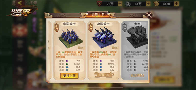 与其他游戏不同的是,在《少年三国志:零》中,不仅三国名将会亲自出征,士兵也会作为重要单位协战,为主将提供属性加成。因此,除了军师、主将,士兵也是游戏的重点培养对象之一。以步兵为例,从初阶步兵到6阶步兵,再到虎贲军、禁甲军等。从低级士兵到高级士兵,不但是属性维度的提升,也会有一些特别契合某些主将的士兵逐步解锁。如 “西凉骑兵”,就对主将马云禄有特殊加成效果。不必一味看重级别的高低,选择合适的士兵,有时就会给主将带来意想不到的提升。