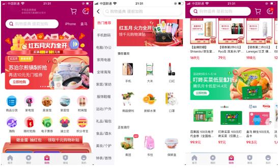 商城页面的模块相对来说比较固定,根据不同的运营情况,分别在精彩频道,精彩活动,品牌优选等进行商品展示。并不会出现像淘宝一样根据你的最近浏览的商品为你推荐相似的商品。