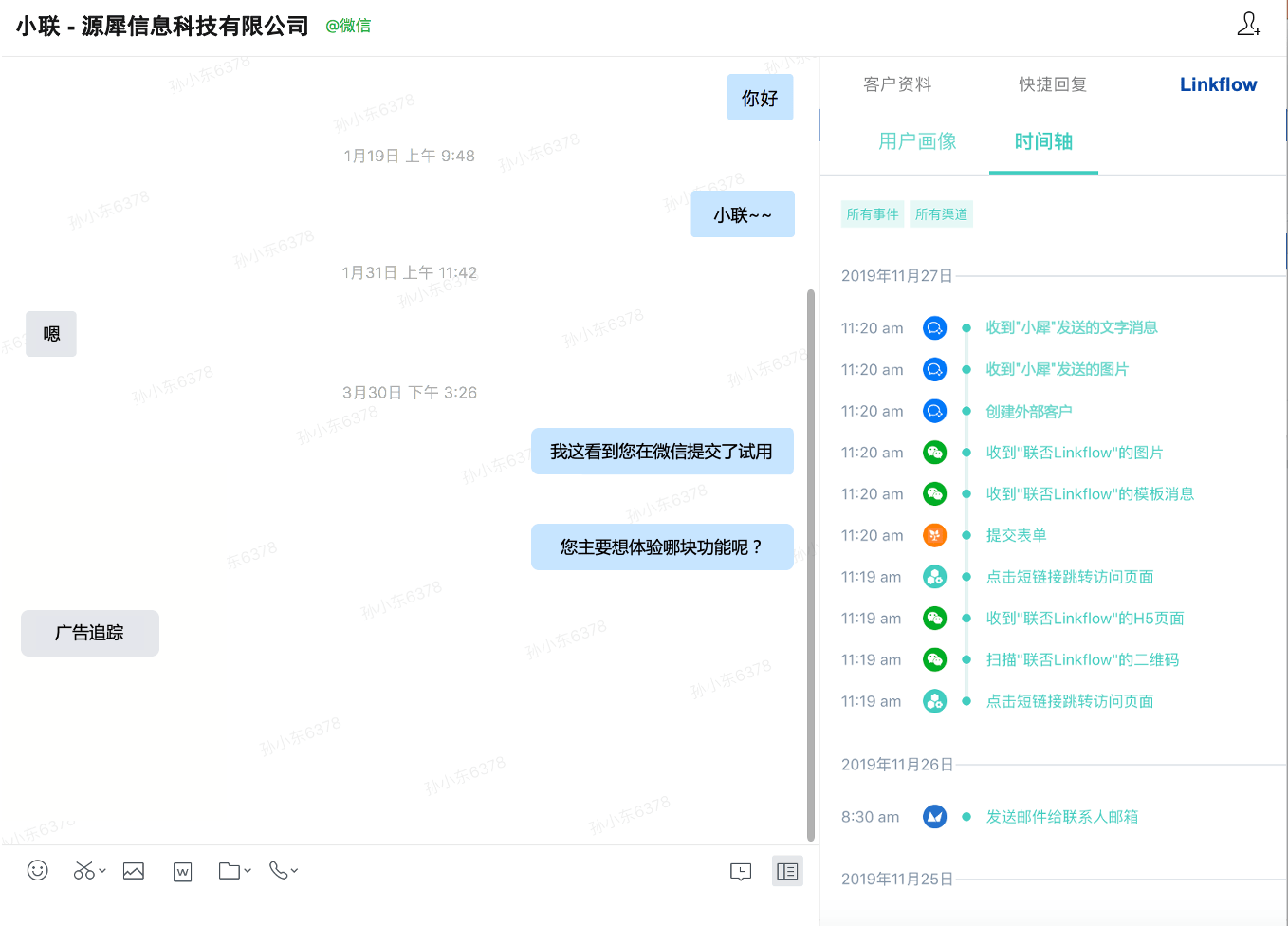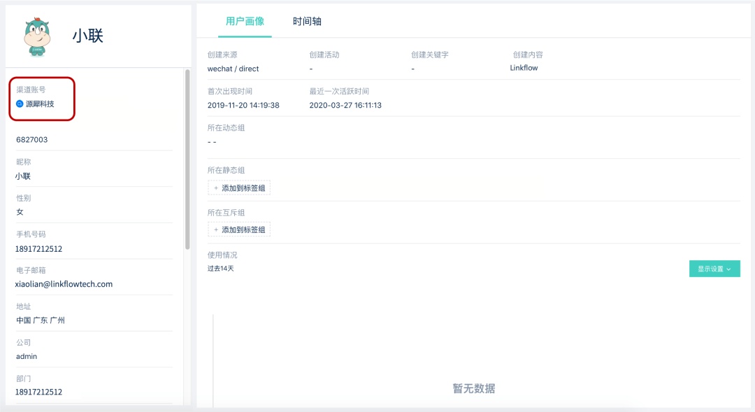 如果该客户已经关注过企业的微信公众号、小程序,又或是在企业官网上提交过注册信息,Linkflow会通过Union ID自动将微信公众号、小程序的渠道账号与企业微信渠道账号合并,通过唯一识别ID,还能和官网等更多触点上的客户数据进行合并,生成完整的客户视图,并且企业与客户的双向互动都将呈现在行为时间轴中。