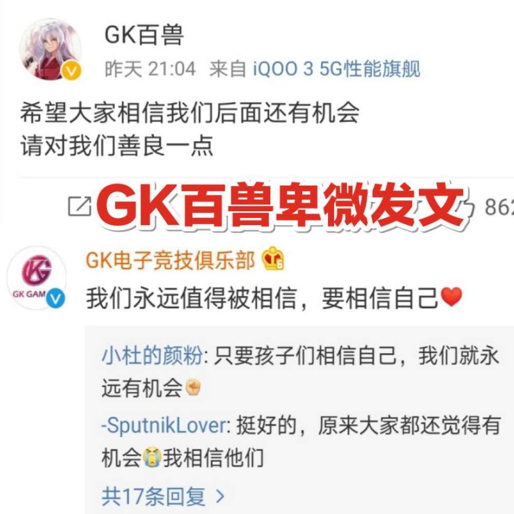 除了LGD大鹅受到了“骚扰”之外,这对GK战队也是一种“侮辱”,赛后GK边路百兽“卑微”发文“希望大家相信我们,后面还有机会,请对我们善良一些”,作为一位没有拿到太多荣誉,知名度不高的新人,发出这样的感慨,还是很让粉丝们心痛的,难道他们就不配赢,不值得一个季后赛机会吗?