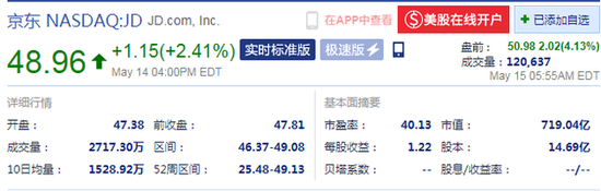 北京时间5月15日下午消息,截至发稿,京东集团盘前涨4.13%,报50.98美元,当前市值为719.04亿美元。