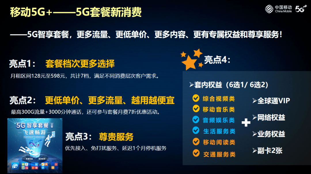 提供了128元起的七档套餐资费,以及更多流量、更低单价、更多内容、更有专属权益和尊享服务。