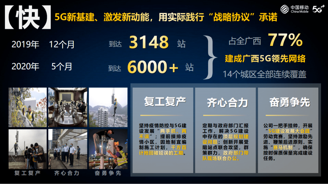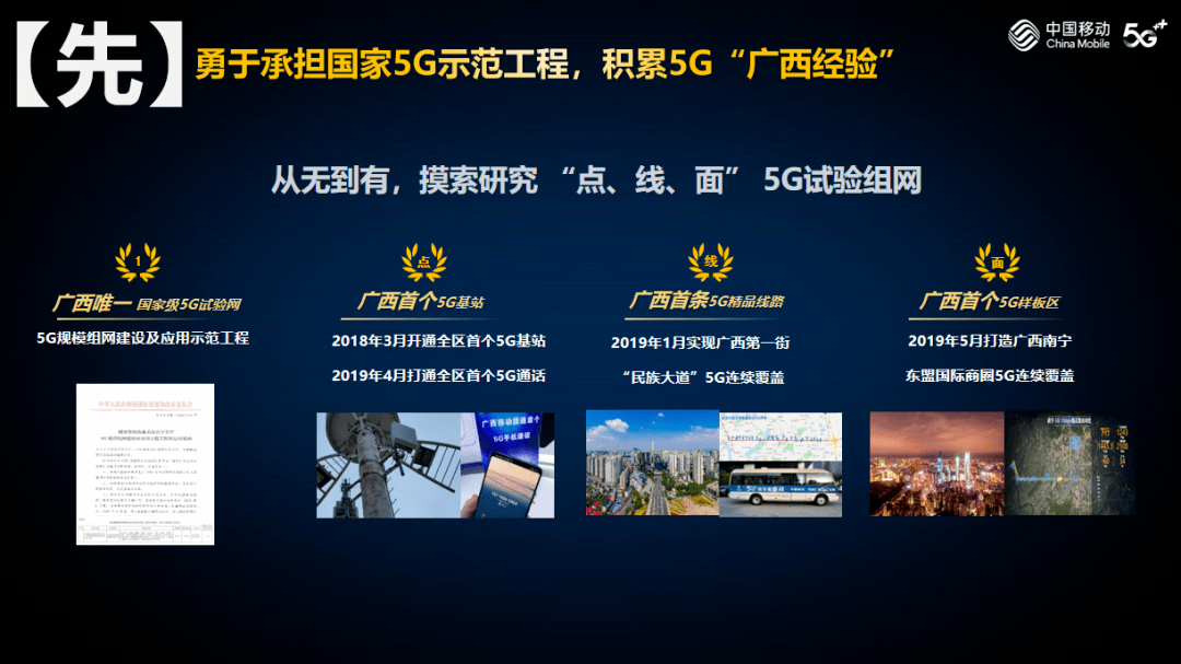 在5G战略落地过程中,广西移动充分发挥网络优势,加快布局5G网络建设。与此同时,广西移动积极构建5G生态系统,共筑新模式、共享新资源、培育新动能,助力各行各业的高质量发展。