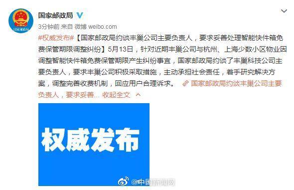 【国家邮政局约谈丰巢公司主要负责人 要求妥善处理智能快件箱免费保管期限调整纠纷】5月13日,针对近期丰巢公司与杭州、上海少数小区物业因调整智能快件箱免费保管期限产生纠纷事宜,@国家邮政局 约谈了丰巢科技公司主要负责人,要求丰巢公司积极采取措施,主动承担社会责任,着手研究解决方案,调整完善收费机制,回应用户合理诉求。