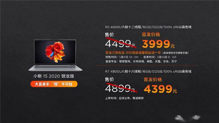 IT之家5月15日消息 在今晚的线上发布会上,联想正式发布了小新 Air 14 2020锐龙版和小新15 2020锐龙版,两款价格相同,R5 4600U+16GB内存+512GB SSD,售价3999元。