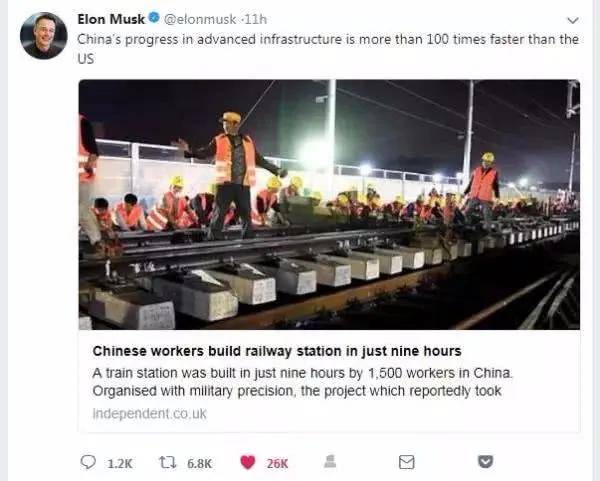 2018年2月,一段《中国工人在9个小时内建造完成一个火车站》的视频在外网走红,视频展现的是1500名中国工人一晚上完成福建龙岩站改造项目的经过。在看完视频之后,马斯克在推特上转发视频并狂赞:“中国基建效率是美国的100倍!”
