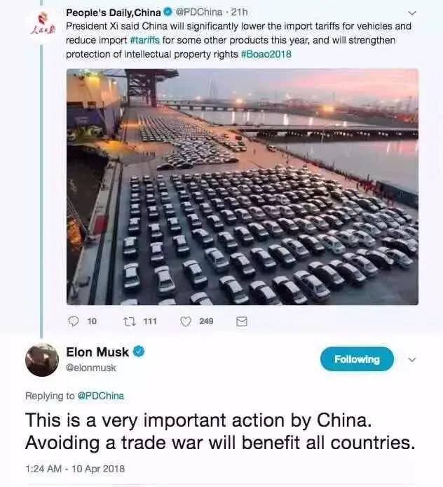 2018年10月,马斯克转发人民日报推特,盛赞中国进一步扩大开放的举措。