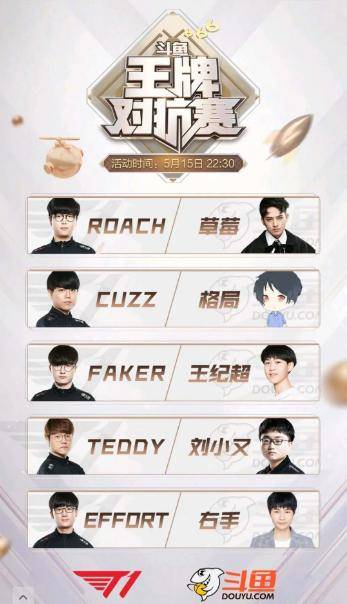 先让我们一起来看一下这次对抗赛双方两边的阵容,T1这边派出是Faker,Roach,Teddy,Cuzz,Effot,相较于他们夺冠的阵容,T1这边只更换了上单选手Canna,T1队可是完全形态了。当然斗鱼主播队这边阵容也是非常的豪华,前WE队员草莓,斗鱼王者主播刘小又,王继超,余小C,以及格局将联手对抗LCK冠军战队T1。