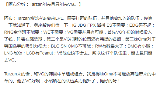 近日,阿布在直播中谈到打野泰山如果来LPL的最佳去处是VG,因为有SKT的教练kkOma,首先四强队伍都有好的打野,所以iG、JDG、FPX、滔搏不需要,而EDG买不起;RNG全华班不能要;其他队伍各有各的打野以及其他问题,所以最适合而且最具有LPL竞争力的就是VG了。