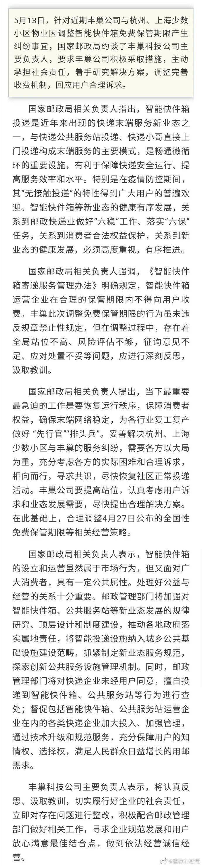 5月13日,针对近期丰巢公司与杭州、上海少数小区物业因调整智能快件箱免费保管期限产生纠纷事宜,@国家邮政局 约谈了丰巢科技公司主要负责人,要求丰巢公司积极采取措施,主动承担社会责任,着手研究解决方案,调整完善收费机制,回应用户合理诉求。丰巢科技主要负责人表示,将认真反思、汲取教训,立即对存在问题进行整改,寻求企业规范发展和用户放心满意最佳结合点,做到依法经营、诚信经营。