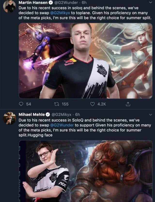 G2战队擅长整活,这早已经不是新闻了。然而,G2整活数年来,还能整出惊天动地的新活,这就让粉丝们非常惊喜了。近日,G2官方再次发布公告称,继Perkz和Caps在夏季赛中位置互换后,辅助选手Mikyx和上单选手Wunder也要互换位置了,这可是粉丝们闻所未闻的行为,要知道,C位频繁互换位置虽然少见,但仍然能够理解,毕竟C位之间仍然有许多共同之处,然而,上单和辅助互换位置,这对于双方来说都是极大的挑战。一个是上路单人线的选手,一个是下路双人线的选手,对于上单选手来说,如何在辅助位给队友保护,如何在对线期做好视野,在前中期游走支援都是非常陌生的,而辅助选手在上路对线中更是很可能陷入极大劣势,G2敢于做出这一调整,不禁让人感叹隐藏在他们"整活"欢乐面孔背后的可怖实力。