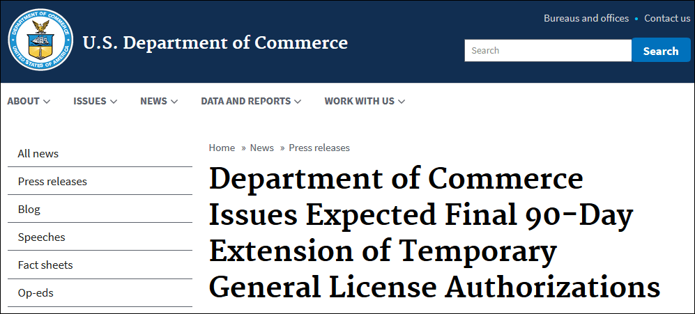 在“禁止”交易的同时,美国商务部允许与华为技术有限公司进行特定有限交易的临时通用许可证再延长90天。尽管华为被列入限制美国供应商与其做生意的黑名单,但许可证允许他们进行特定交易。