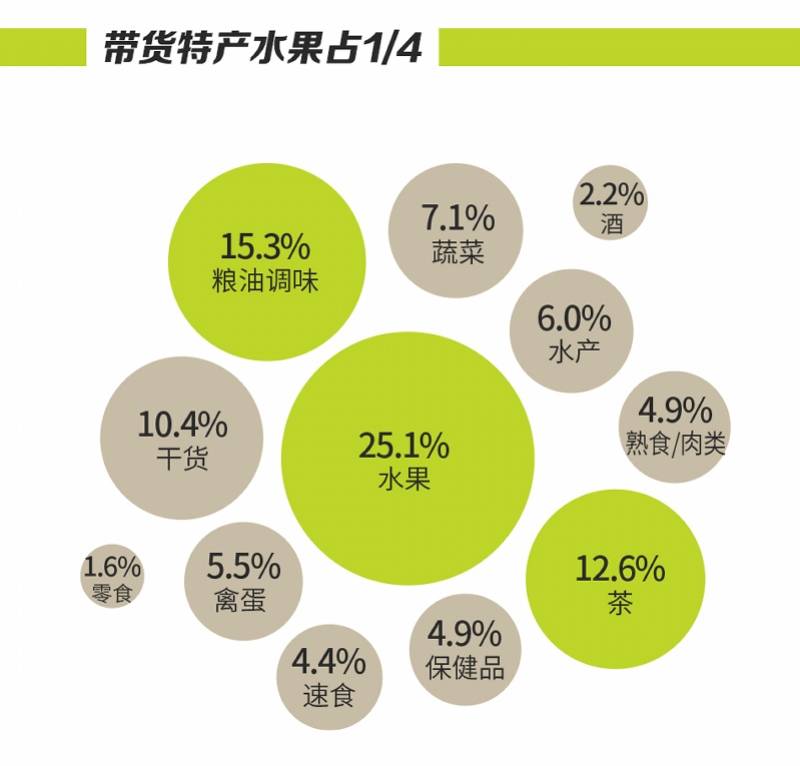 南都大数据研究院统计发现,各地官员代言的农产品中,水果占比超过25%;其次为大米、米粉等粮油产品,茶叶的数量也比较多。