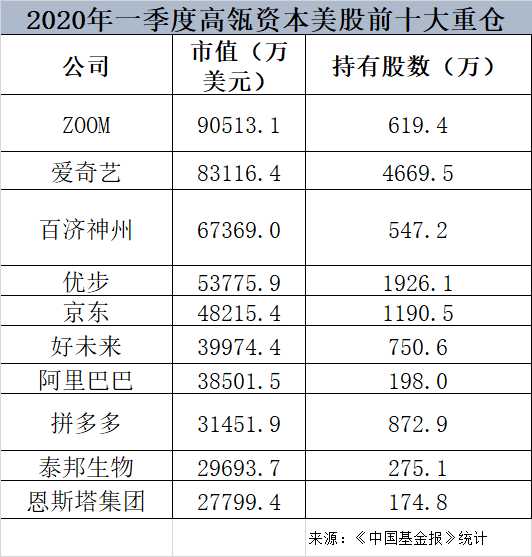 高瓴资本一季度前十大重仓股合计持有市值超51亿美元,占高瓴资本的美股持仓市值近70%的比重。前五大重仓股分别是ZOOM、爱奇艺、百济神州、优步和京东,持有市值分别为9.1亿美元、8.3亿美元、6.7亿美元、5.4亿美元和4.8亿美元。