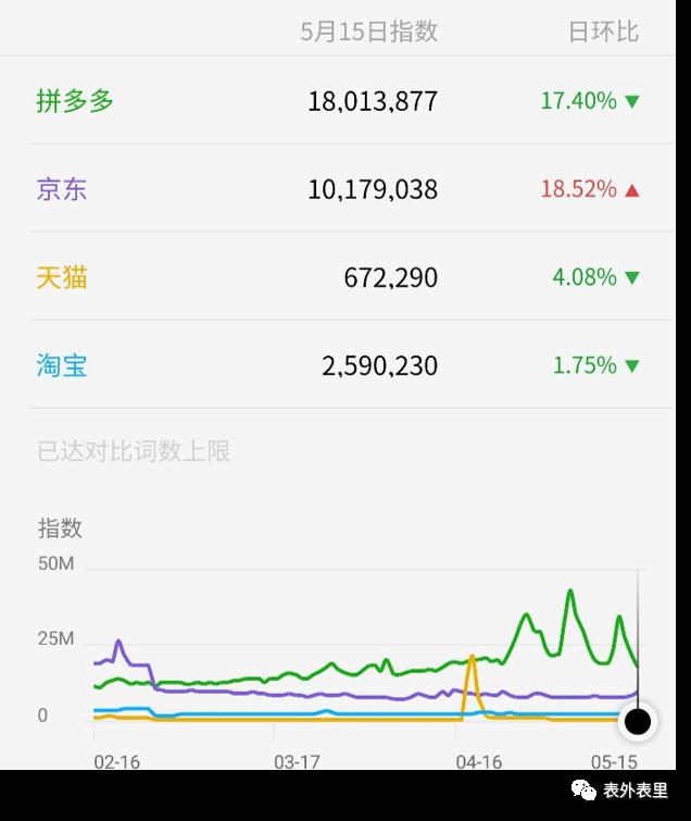 很明显,在2月16号那个时点,明显看出京东比拼多多更受欢迎;而随后就出现拼多多反超的趋势,而且越来越明显。