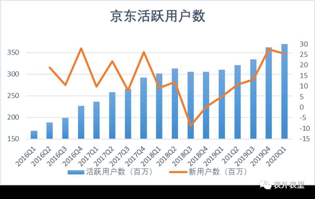 销售费用下降的同时,京东活跃用户数迅速增长,达到3.87亿人次,环比上一季度增加了2540万人。相比2019Q4,超过82亿的广告营销,带来2760万新用户;2020Q1,仅花了50%的钱,获得了92%的新用户,获客效率大幅提高。
