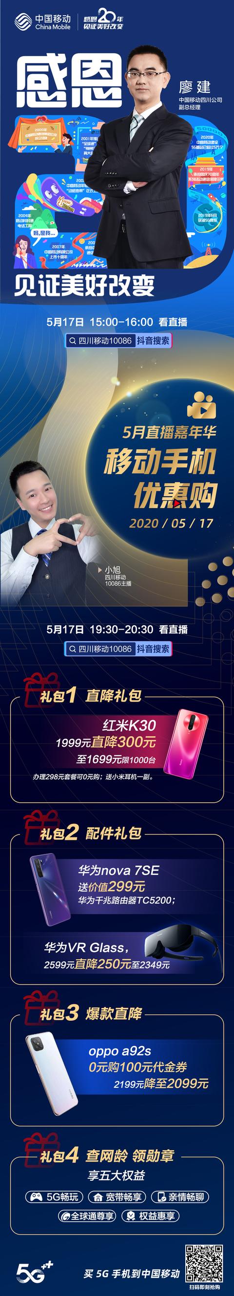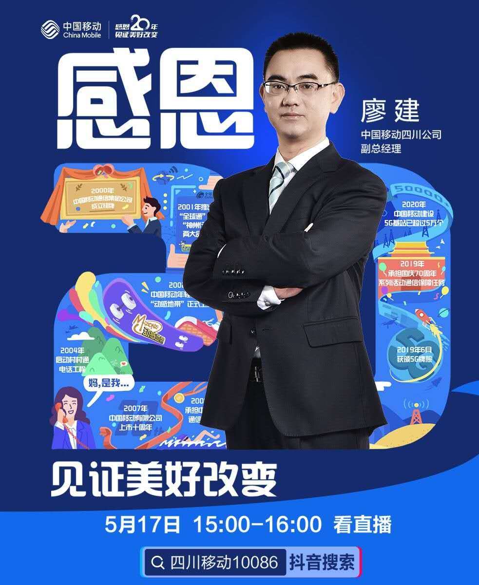 中国移动20年,见证美好改变!为给消费者带来更多最新再潮的5G体验,5.17世界电信日当天,四川移动副总经理廖建将率直播"天团"空降直播间,亲自带货直播。