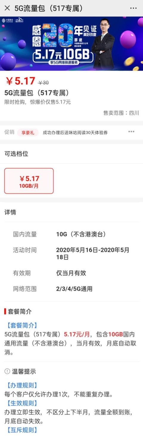 据悉,除了直播好礼。四川移动更推出系列感恩促销活动。例如仅5.17元即可享受10GB/月流量。
