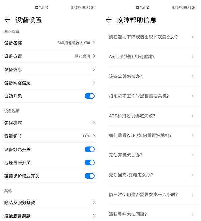 至于设备设置菜单下,则还有诸如勿扰模式、音量调节、地毯增压开关、碰撞保护模式开关、自动升级等实用选项,此外产品的常见故障排除以及使用技巧也能在此找到。
