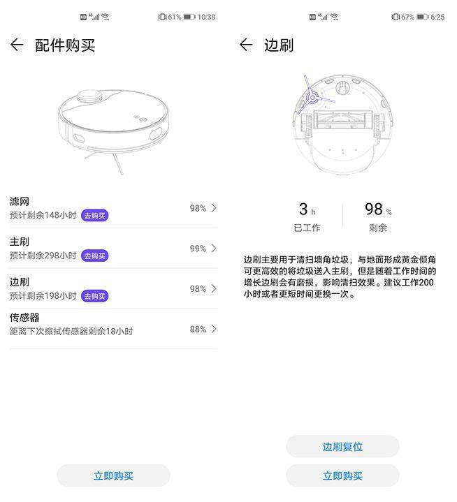 在高级功能菜单下,还可以找到如遥控模式、预约清扫、查找机器人、配件购买等丰富选项,很贴心的一项是进入配件购买菜单后,滤网、主刷、边刷的预计剩余寿命都会直观显示,另外是否需要手动擦拭传感器也可以在这里直观获悉。