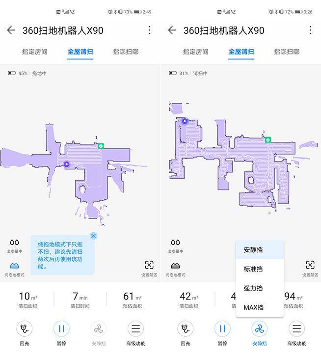 考虑到不同用户对噪声级别的接受程度有差异,华为智选360扫地机器人X90提供四档清扫强度,包括安静档、标准档、强力档、MAX档,吸力级别从600Pa、1000Pa、1500Pa、2200Pa依次递增。在家中有人期间建议选择安静档或标准档,无人时则可以任意选择,倘若需要清扫的地面较脏,则建议选用MAX档。