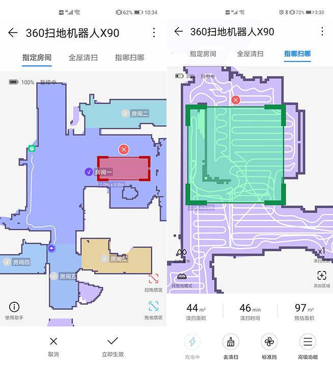评测期间我们使用华为P40 Pro连接扫地机器人,开启智慧生活App,按照提示简单几步操作便成功加入设备。首次清扫建议用户选择全屋清扫模式,待扫地机器人完成之后,便可以清晰看到全屋的地图和清扫面积,后续便可以根据实际需要设置禁区,以及对指定房间进行清扫,或者也可以用“指哪扫哪”,非常适合对固定区域的高效清洁。