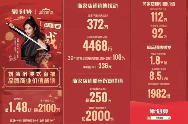 在刘涛的直播中,聚划算的内容营销威力初现,各个店铺不仅涌入了天量新客户,数据显示,店铺的平均访问人数达到112万,其中新客户占比达到92%,而且有极高的转化率和留存率,29个店铺全店销售同比增长超过100%,单品最高成交笔数达到8.5万,平均店铺收藏增长则超过250%,这些数字意味着,在掏出真金白银买买买的同时,大量喜爱直播的观众还直接变成了店家的“私域流量”。