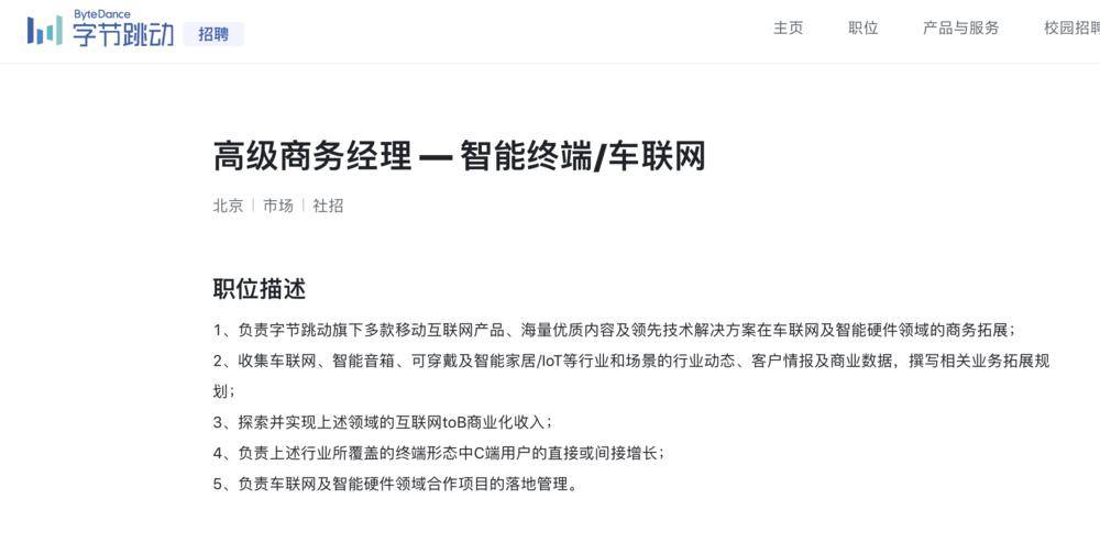 字节跳动官网也已经挂出车联网相关的招聘信息,目前有高级产品经理和高级商务经理两个岗位。